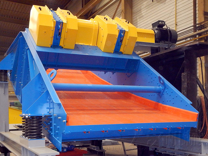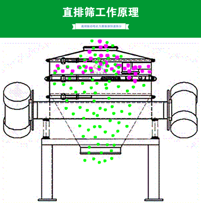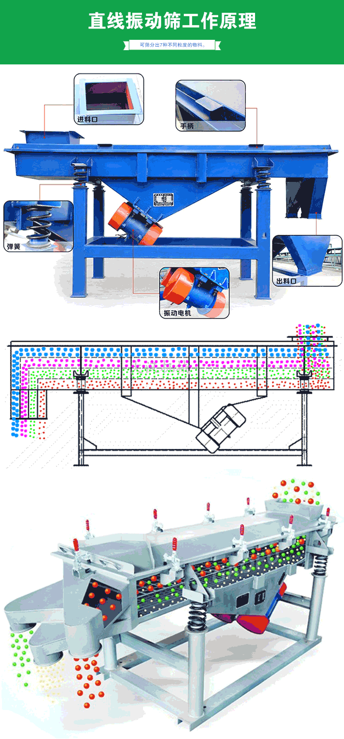直線振動篩采用雙振動電機驅動,當兩臺振動電機做同步、反向旋轉時,其偏心塊所產生的激振力在平行于電機軸線的方向相互抵消,在垂直于電機軸的方向疊為一合力,因此篩機的運動軌跡為一直線。其兩電機軸相對篩面有一傾角,在激振力和物料自重力的合力作用下,物料在篩面上被拋起跳躍式向前作直線運動,從而達到對物料進行篩選和分級的目的?捎糜诹魉中實現自動化作業。具有能耗低、效率高、結構簡單、易維修、全封閉結構無粉塵溢散的特點。最高篩分目數400目,可篩分出7種不同粒度的物料。