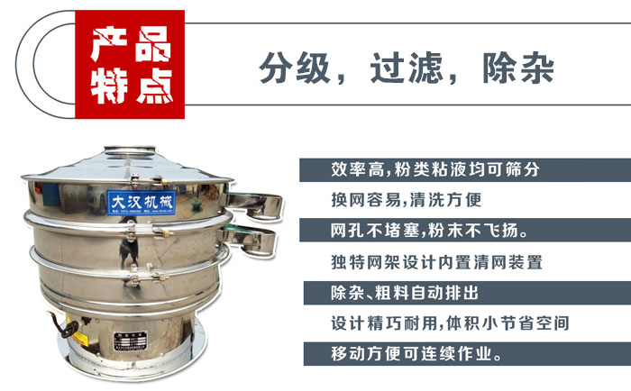 "大漢"DH系列振動篩產品,經客戶多年使用,獲得大量的一線反饋建議,在自有成熟的篩機制造技術基礎上,大漢機械工程師以滿足客戶需求為標準,多次技術改進,篩分效果更加優越,采用"通用"動力激振器,三維動力更加突出,適用范圍更加廣泛,大漢機械公司可根據客戶需求設計特殊型號,無論物料是干是濕,是精細是粗糙,是比重大是比重輕,0-400目都可以篩選,不管是液態,還是漿狀的0-600目都可以過濾。"大漢"旋振篩系列產品同時配備專門的篩網清理裝置,把堵網率降低,過網率和處理精度得以有效提高。"大漢"具備特殊型號制造的能力讓顧客對"大漢"有更多的選擇。