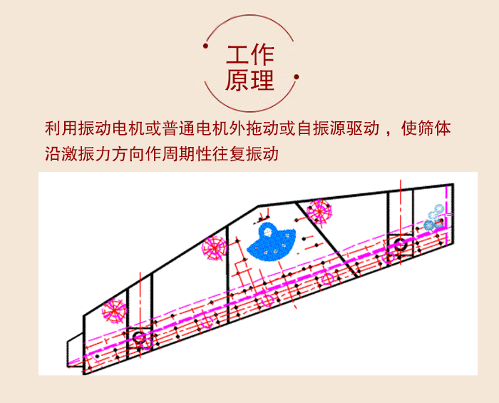 ZSG系列礦用重型振動篩是利用振動電機或普通電機外拖動或自振源驅動 ,使篩體沿激振力方向作周期性往復振動,物料在篩面上沿直線方向作拋物線運動,從而達到篩分目的。